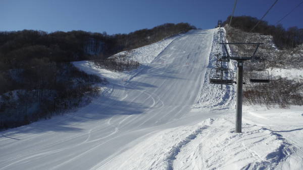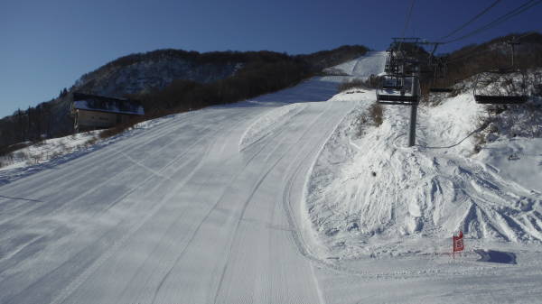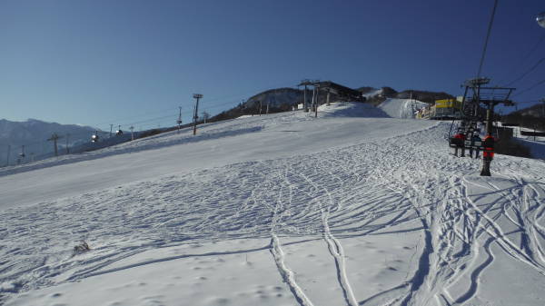まずは予定通り山頂リフトに1番乗車。 後ろもしばらく誰も乗ってきません。 現時点では、リフトもコースもまるで貸切♪ |