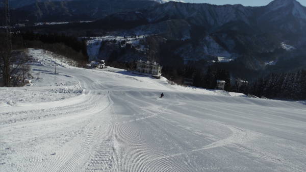 パトロールが気持ちよ〜く滑った跡はありますが、まあそれは想定内。 1本目はマジ貸切状態滑走。 2本目もまだ数人しか行っていない状態なので、まだまだシマシマバーンを満喫。 シマシマはいつもは1本で終わってしまうところ、今日は3本目までありました。 |