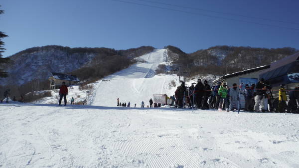 中央口から観光口にバス搬送された人がどんどん供給されてきて、6本滑り終わったところで大行列になりました。 お腹いっぱい脚パンパンになったので山頂からは撤退です。 |