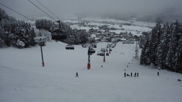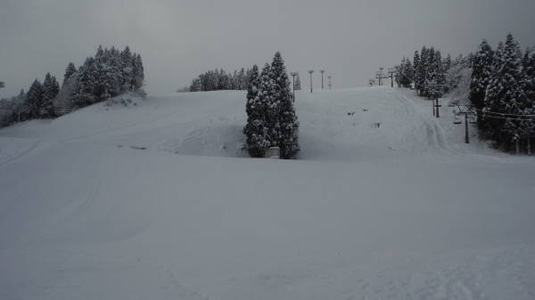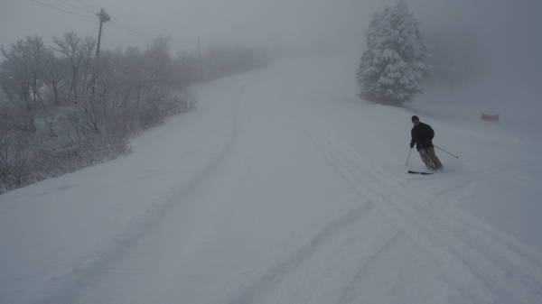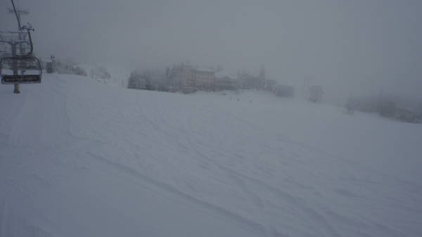 ここまで下りれば、視界良し。 しかし、ここまで下りると雪がかなり重し。 観光口に戻って、牧場外回りを4本ほど滑って本日終了。 |