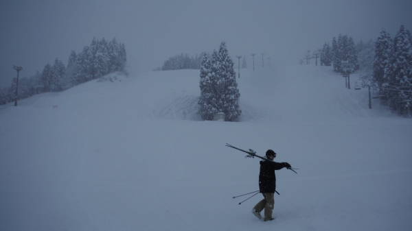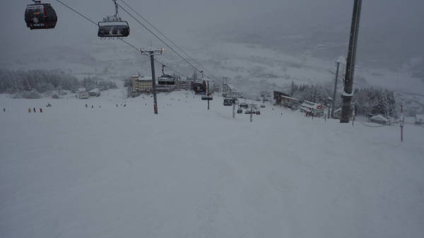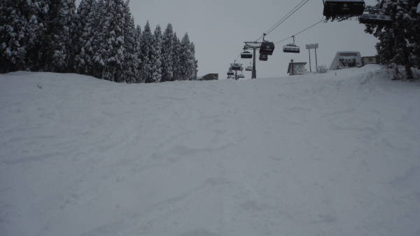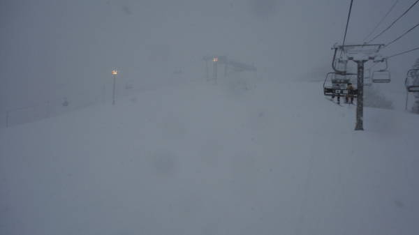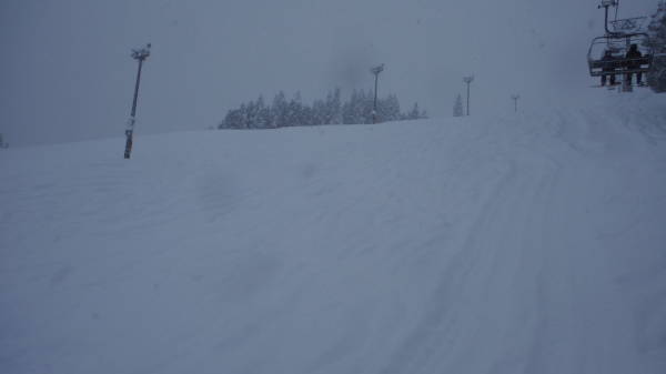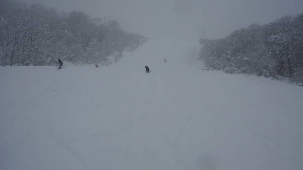 圧雪車が入ったあとに10cmほど積もりました。 どこもかしこも非圧雪バーンとなっています。 視界も良くないので、圧雪車が入ったところとそうでないところの境目がわかりにくいです。 |