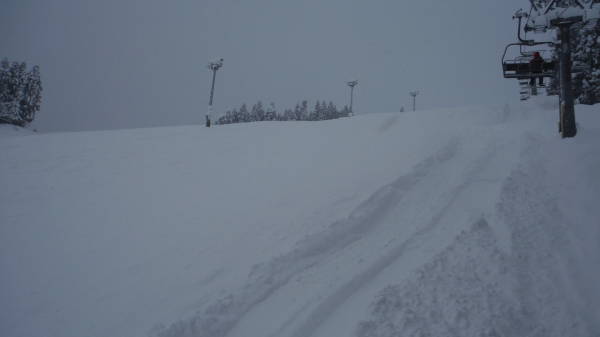 ちょうど山頂リフトが動き出したところだったので、山頂も行ってみました。 非圧雪エリアの新雪は、ほとんど下と変わらない感じの重さだった。 パウダー整地は気持ち良かった♪ |