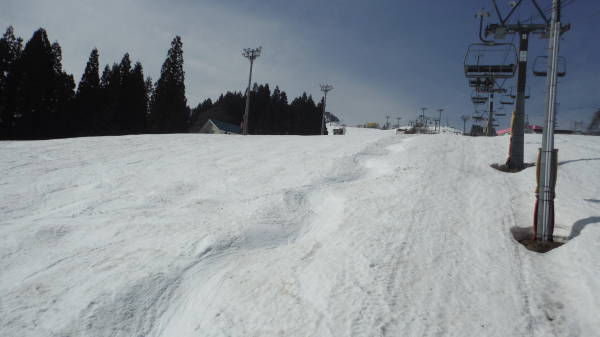リフト脇のコブコースも、圧雪されて今日はコブなし。 結局、下のダイナミックに戻るのが良さそうです。 |